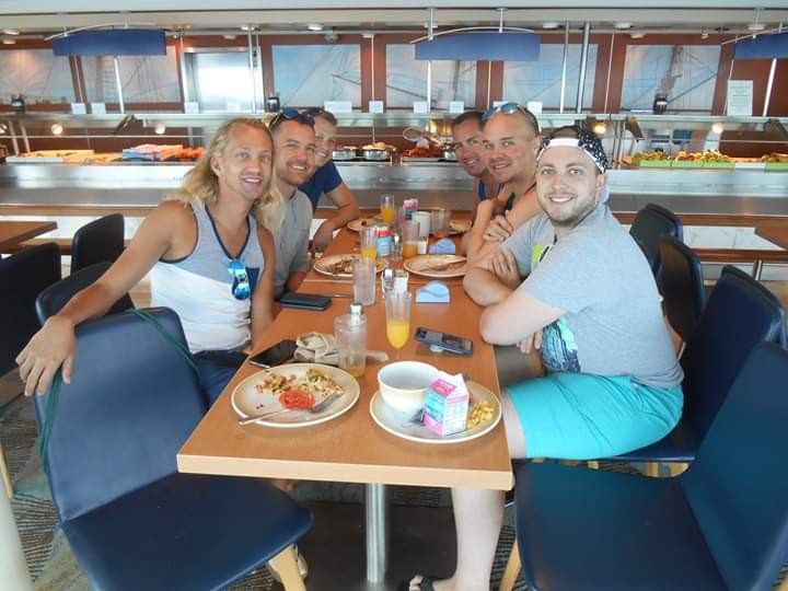 We woke up early, got dressed, and ran down to the Windjammer to get our last breakfast on the ship. This was a sad morning for us. We saw the new friend that we had met, Pat, and took pictures with her. After that we heard one last “washy washy”, then finished up and went back to the cabin to get our things. Debarkation for us was supposed to be off of the ship at around 8:15 am, but it was 8:15 and they were still working on the Self-disembark group. We asked where to wait, and were shown to the Schooner Lounge, but Andie Asorio guided us to the self-disembark line, so we got in that.