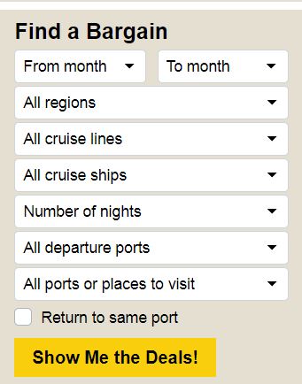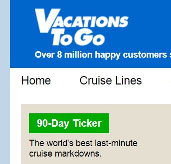 First off, we’re looking at shorter last minute cruises on the Vacations To Go website. You can go to the website and click on the 90-Day Ticker to find last minute cruise deals. You can sort them by date, price, or however you want to. You can also use the advanced option to find cruises that leave later. We can leave from a number of US ports, so it shouldn’t be hard to find some good deals.