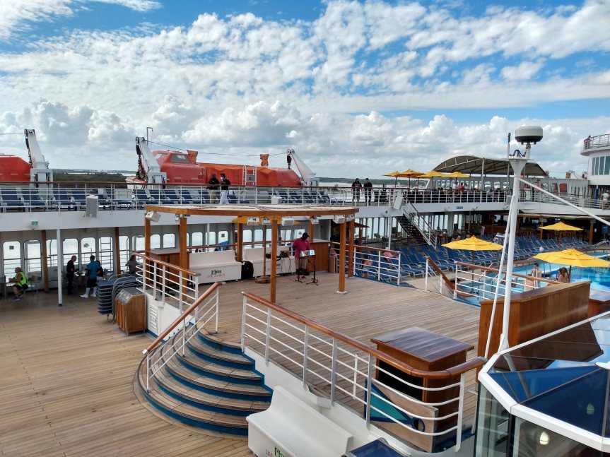 One of the few good things that came out of Covid was the easier, much more pleasant, Muster Drill. On the Elation we were told to go to our Muster Station, which was A (in the theater) when we got on the ship. We actually went after lunch. It took less than a minute for the crewmember to show us how to put on our lifevests, then they checked us into the system as having done our drill. No more standing outside in the heat behind a bunch of people.