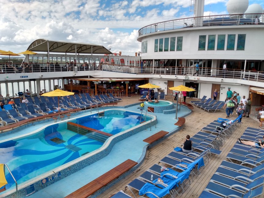 We decided to find the Buffet. As usual, it’s on the Lido Deck, which is deck 10 on this ship. The ship seemed crowded, but most ships do on embarkation day. We did manage to find a table fairly easily in the buffet, and while he saved the table, I went to get some food. I was starving and thirsty after that drive. I did find that the buffet has limited food selection, but there was enough for us. Honestly, I was so tired that I don’t remember what I ate, but I do remember the cute Halloween dessert selection. I love Halloween cruises! The buffet was very warm that first day, but maybe because it was embarkation day and so many doors were opening up.