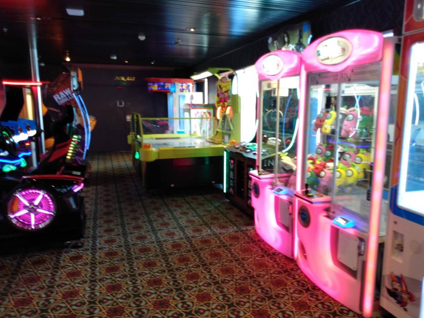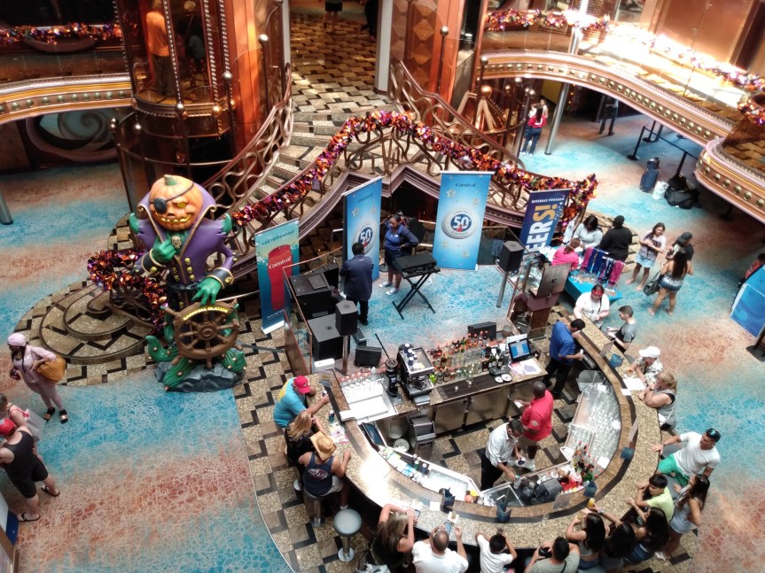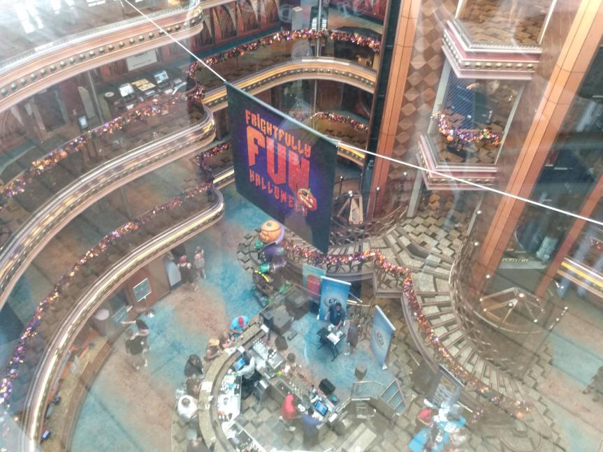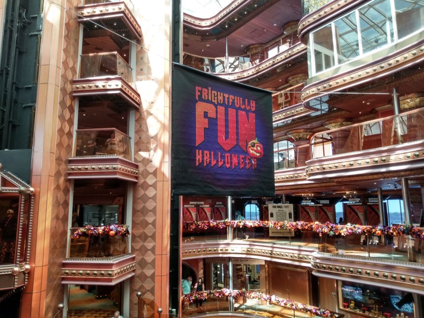 This is the smallest ship that we’ve sailed on since our first cruise on the Carnival Fantasy. The Carnival Elation is in the same class that Fantasy was, and similar in layout. But after sailing so many large ships, this one takes some getting used to. We walked into the Atrium area and saw the usual Halloween decor out, including Patch, the Pumpkin. But the Atrium is very small compared to most ships.