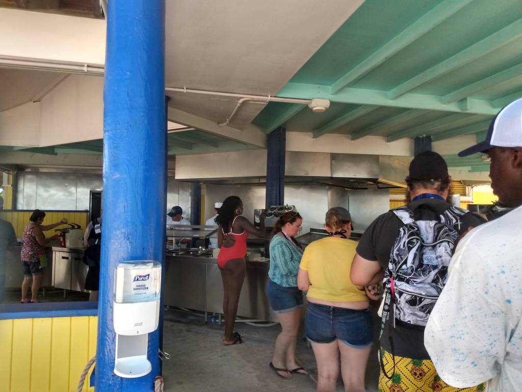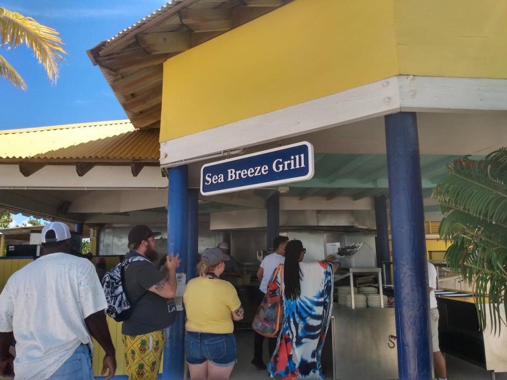 There is a buffet on this side of the beach as well as the other side. I’d imagine that the one on the quiet side of the beach was less crowded. Lunch consisted of hamburgers, hotdogs, and chicken, as well as potato salad, a really good pickled broccoli salad, and cole slaw. They also had fruit and a few desserts. The banana bread was really good. Drinks were the same as on the ship.