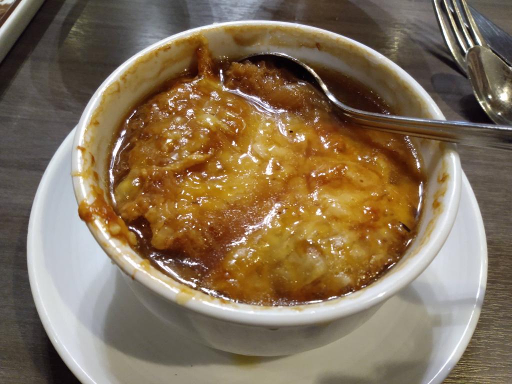 Dinner was good, BBQ ribs. Gator for an appetizer, along with french onion soup, and a banana split for dessert. And there was a show by the waiters. I always enjoy that.