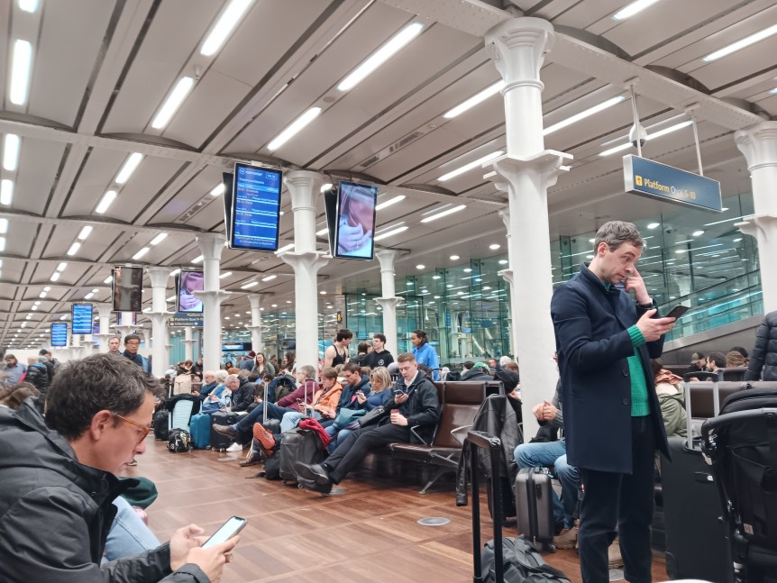 Paddington Station is open air but has restrooms in two places, and places to eat. No tables though. Pret A Manger was my favorite, and there is a Cornish Pasty shop that was good. We ended up getting Burger King breakfast sandwiches and coffee the day we were headed to St. Pancras and the Eurostar, and found some benches.