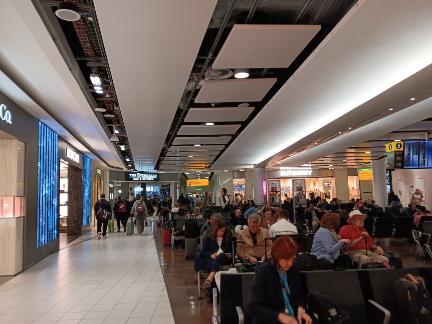 You have to wait in the main terminal until they give you your boarding gate about an hour before the flight. Then you walk what seems like a mile to your boarding gate. There, you will sit and wait for boarding, but it didn’t take long. Boarding was quick, but they used the Boarding group to load instead of seat numbers. That made it harder because you were trying to get your luggage up above into the bin, and people were waiting behind you to get to their seats. Less efficient than Orlando.
