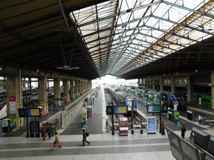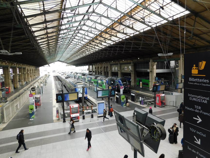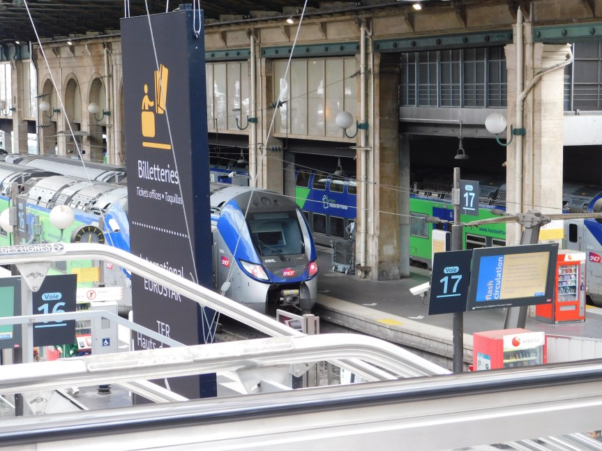 They suggest that you get to the station 90 minutes before your train leaves, and that amount of time was adequate. They don’t even let you into the security area till 90 minutes before. You have to go through England and France passport control and security on each end before you get onto the train, but they don’t care about the liquids rule. You can buy food, snacks, or drinks before you get onto the train and take them onto the train. They also sell food on the train in a couple of cars. They will announce where. In St. Pancras Security is on the first level, in Gare du Nord security is on the second floor, where you see the England flag. There are very few seats in Gare du Nord, we ended up sitting on our luggage to have lunch and wait to go through security. Gare du Nord has restaurants, even a 5 Guys, and a store to buy drinks and food.