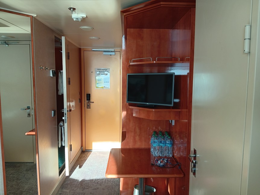 There’s not much to watch on the small television. And at first I couldn’t figure out how to work it. But just press the channel section on the remote to get more channels. There are a few sports channels, a couple of movie channels that rotate the same few movies throughout the cruise, two channels that have mostly the same shows on all the time, and some channels about the ship.