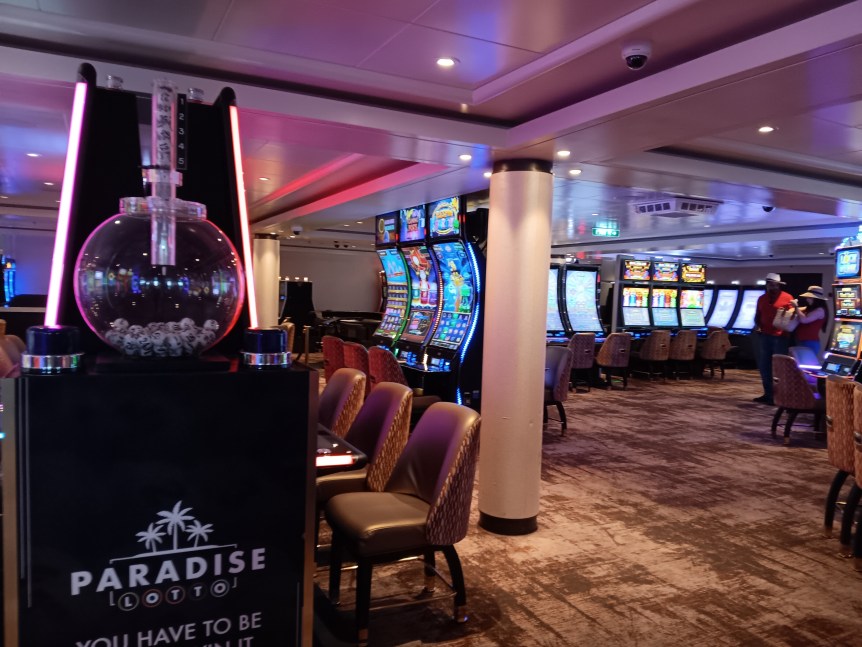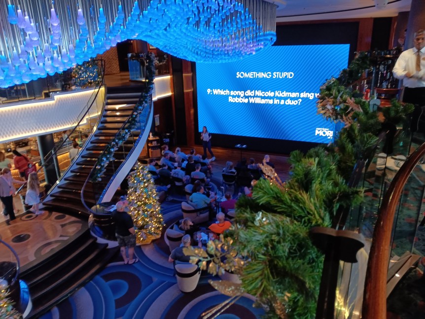 Deal or No Deal is basically another way for the Cruise Line to take your money. If you want to participate (you don’t have to), you buy cards (sort of like bingo cards). One was $29, then you could get discounts if you bought more. If you’ve watched the Howie Mandell show, Deal or No Deal, you know how it goes with the briefcases. It didn’t seem to me that many people won much. One guy won $400, one won $50, then there were a lot of little worthless prizes. Glad I didn’t participate.