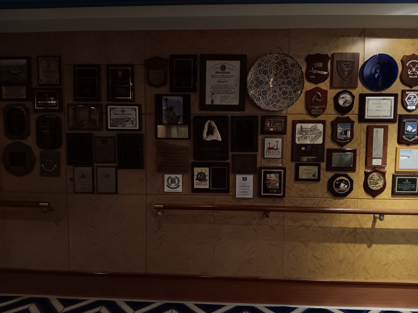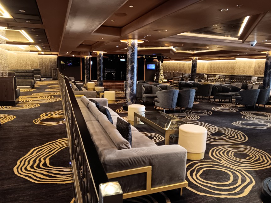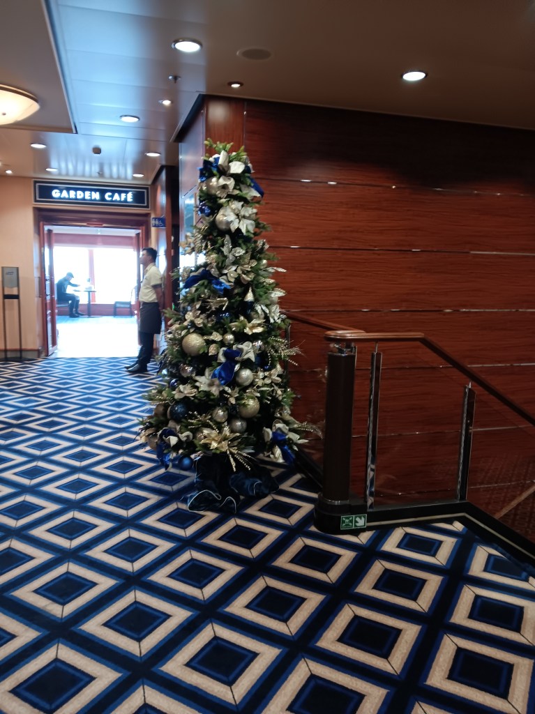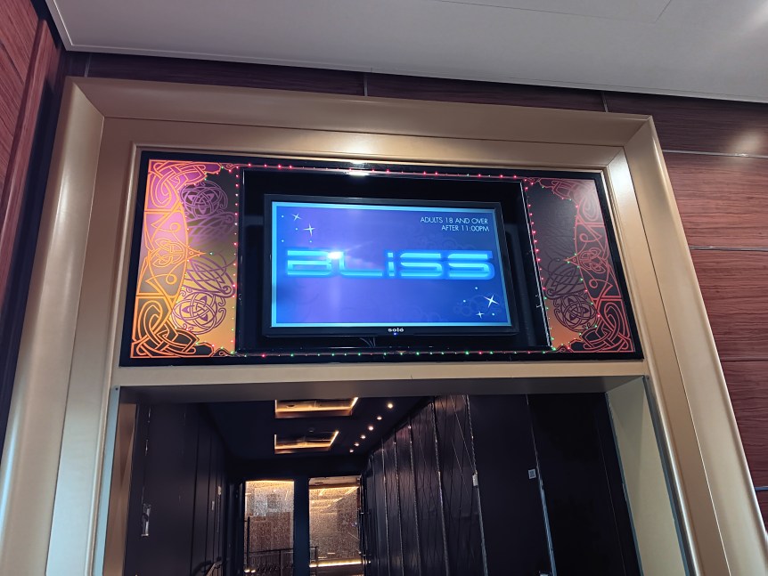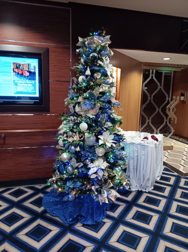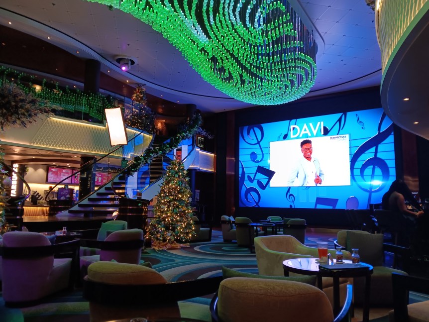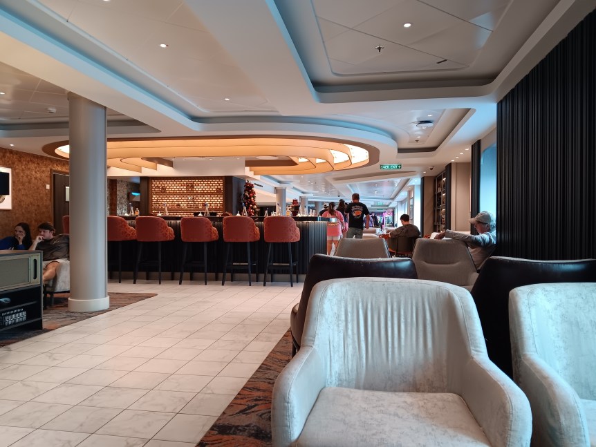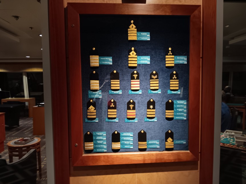 Since I’m a Travel Agent I was invited to the Captain’s Party in the Bliss Lounge. I’ve done Captain’s Party’s before, but this one was strange. We had to get squirted with antibacterial spray before we went in, which I can understand. But when we got in, instead of the crew shaking our hands, they said hi or nodded to us. Then we were given the choice of a pre-mixed fruity drink or wine. They then came around with some small hors d’oeuvres. A singer was singing softly in the background. A couple of the officers mingled a bit. I spoke to one of them and told him that I was disappointed that I never met my room steward. He promised that I’d meet him the next day, but I never did. Then all the officers disappeared and people started leaving. I don’t think that I was in there for 20 minutes all together. It was just strange.