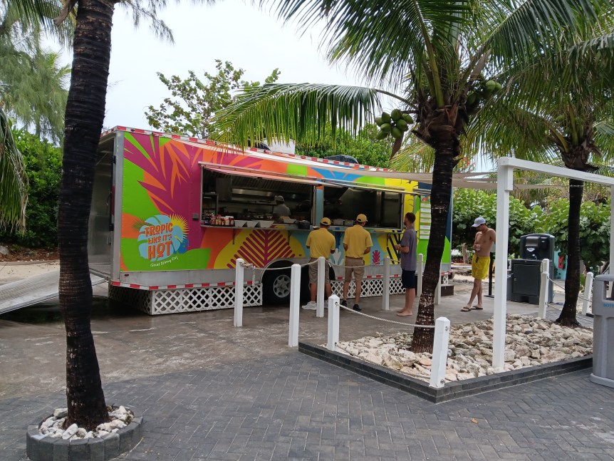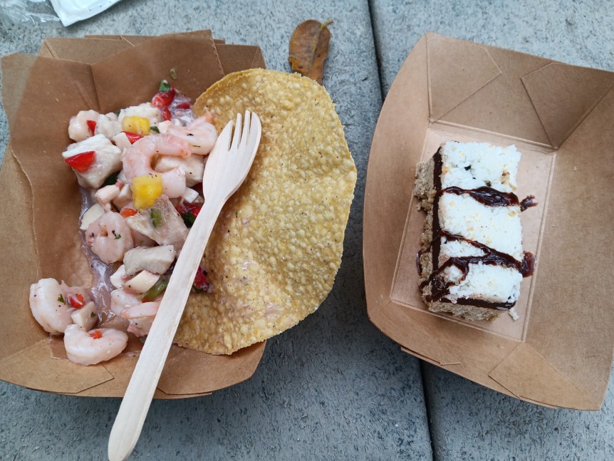 There is a buffet on the island with hot dogs, hamburgers, and normal picnic fare, and I saw one food truck way at the end of the pathway. That food truck had sandwiches, ceviche, and deserts. The coconut chocolate fudge bar was to die for, wish I’d had more than one. Wish I had one right now or had the recipe.