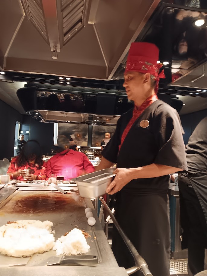 I choose the Teppanyaki Grill for my “free” specialty dining. I could only get a reservation for 9 pm on day three, but I wanted to sit with others to dine for a change, and I knew that I would with Teppanyaki. The host was able to sit me at an 8:30 pm seating instead. And as usual for Teppanyaki, it was a very fun and enjoyable experience.