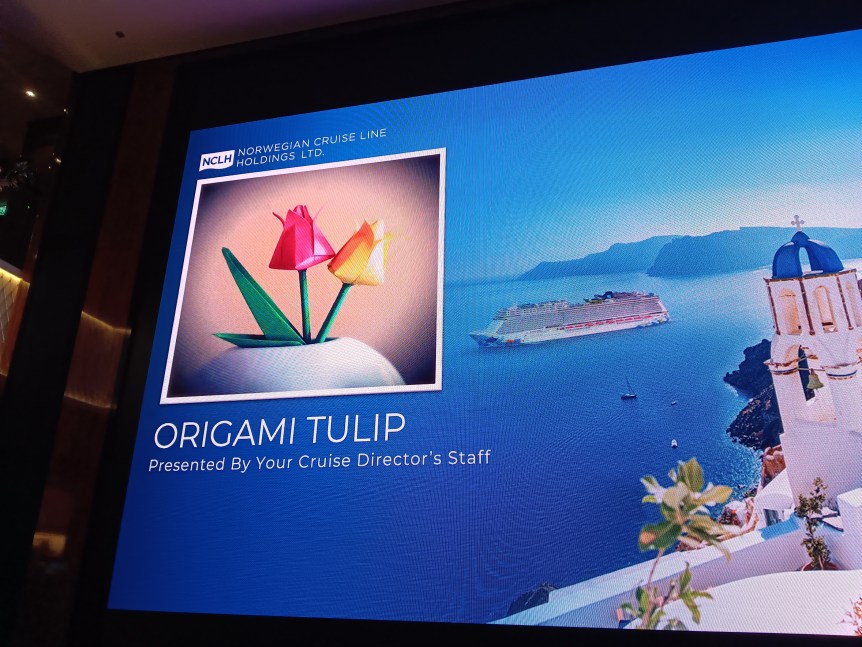I did try to make an origami Lily, but either the directions were horrible or I am not talented at all. I also saw a lot of trivia shows each day. There were bands and singers scattered around the ship in different venues also. No comedian shows at all.