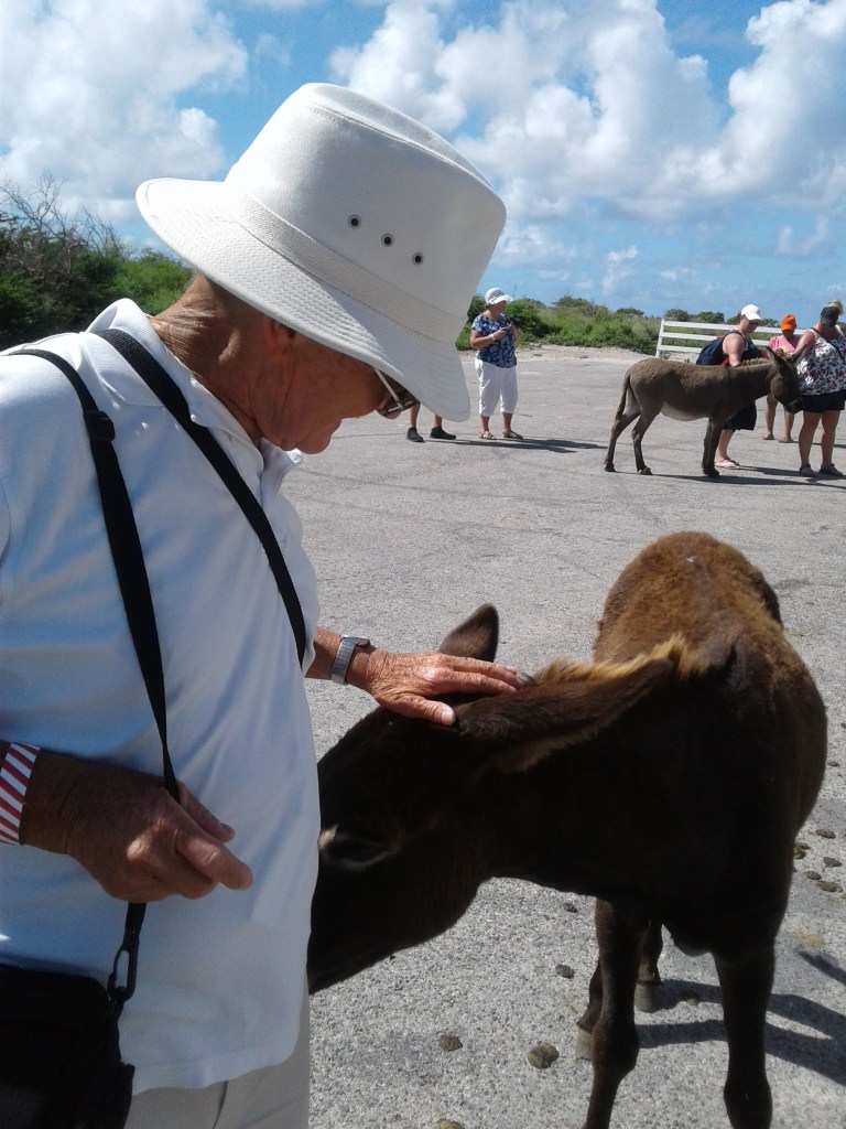 Once we got going, it was much more comfortable. There was a nice breeze produced by the open air tram, and Tracey talked about the island as we moved along. The island seemed to still have a lot of hurricane damage, but the most interesting thing to me was that there are wild donkeys, and also horses, standing along the road. Tracey explained that the Spaniards had brought the donkeys over to help in their salt mining trade. But once they stopped salt mining, they left the donkeys (or as he called them…jackasses), to fend for themselves. Seems like they did a really good job. They are everywhere.