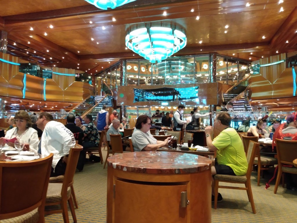 We’ve been on Carnival Magic on Halloween before five years ago. She looks mostly the same. There were fewer Halloween decorations this time. Last time it was full of blow up decorations, this time it was mostly a huge Halloween statue called Patch the Pumpkin. Really cute. And some nice Autumn garland. The one thing that always gets my attention are the lights in the Atrium area of the Magic. To me they look like bloodshot eyeballs. And there were a lot of people waiting to get on the elevators. A number of elevators were being used to bring up luggage, so it was a wait.