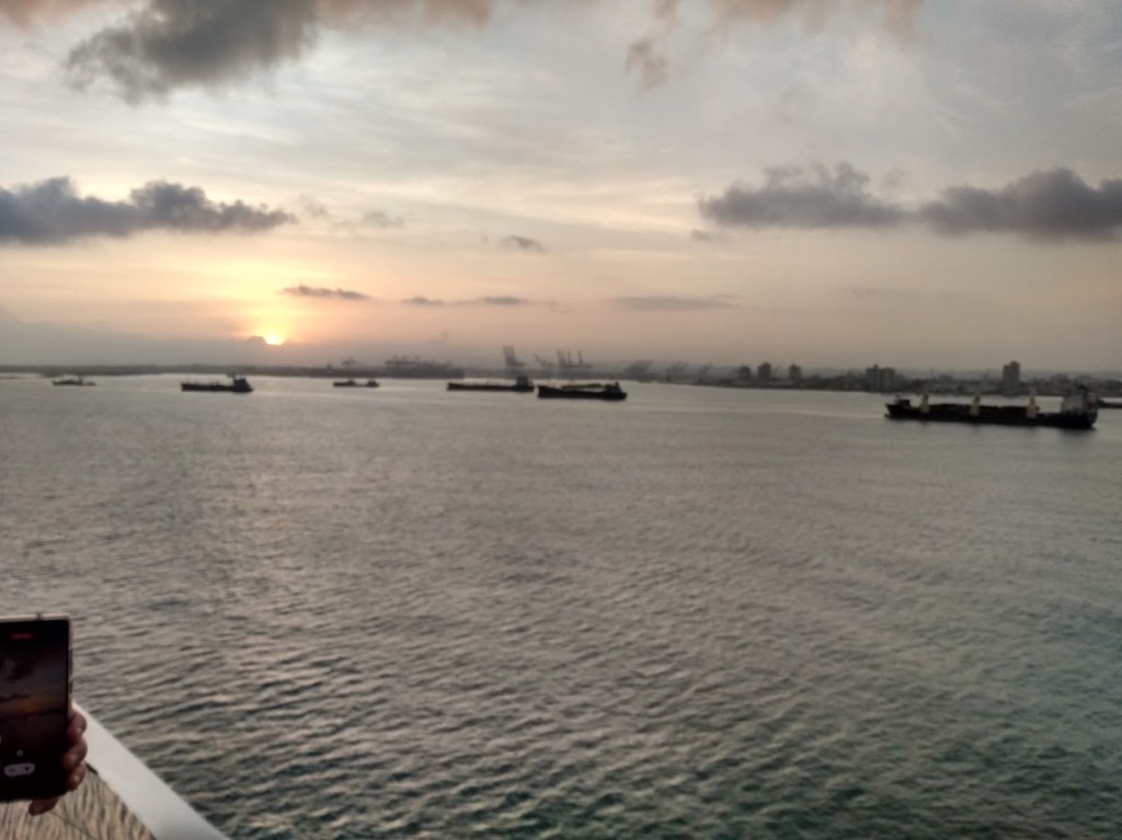 Deck 9 at the very front of the ship was where we went. If you go through a door you can get to some prime viewing area with lower railings and no plastic windows to block the view. There were already a lot of people there, but we found spots and stayed there. This is the first time that I beat the sunrise on a cruise, I think. I did get some good pictures of it.