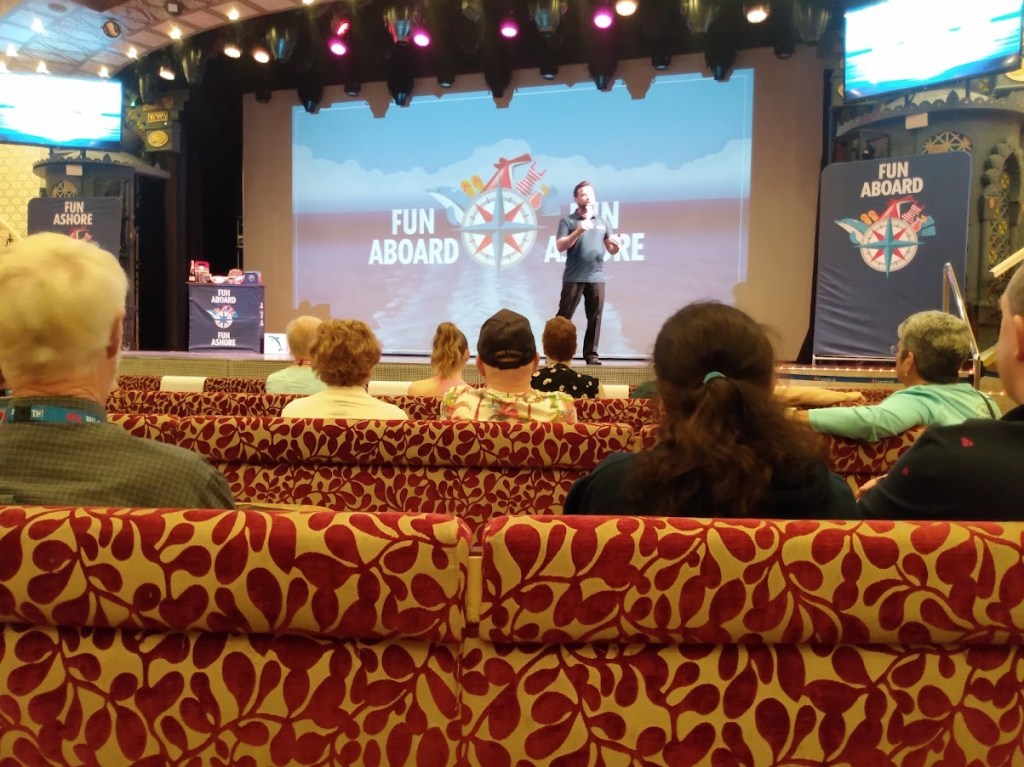 We decided to go to the Shore Excursion show hosted by Filipe, our Cruise Director. Filipe seems to be a fun Cruise Director, and comes from Rio De Janeiro, Brazil.