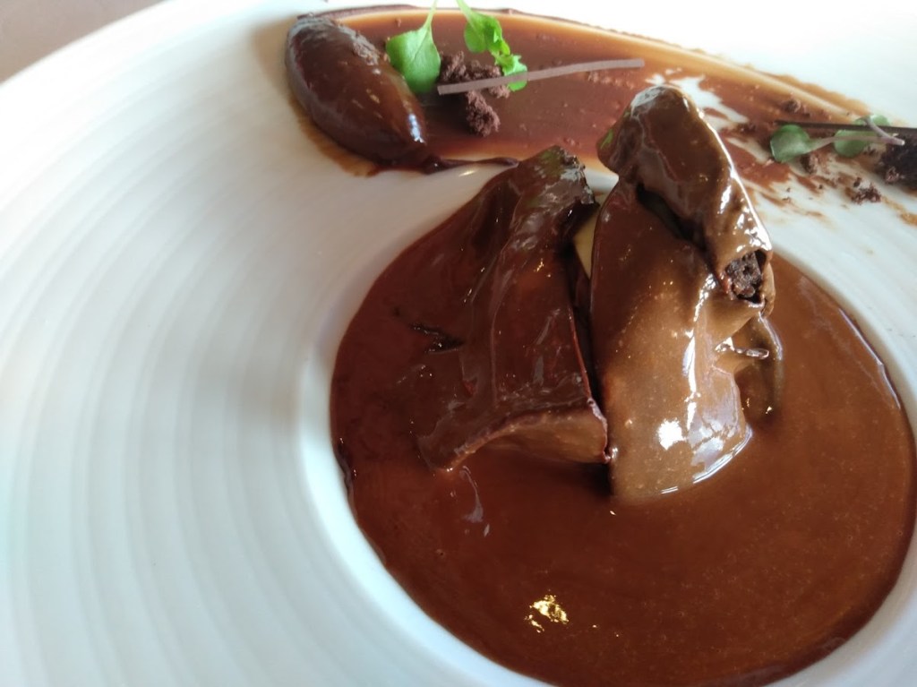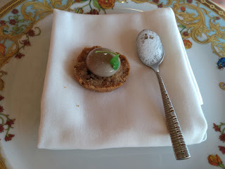 Before our meal arrived, we got a sample from the chef. I’m really not sure what this was, but it was rather strange looking. It was a small spoon with something bubbly on it, along with a wafer and something brown on it. Actually, it did not look appetizing at all. I tasted it and it wasn’t too bad, but it’s not something that I would ever order.