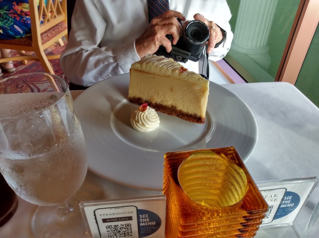 My appetizer was French Onion soup, which was hot and tasty. He had shrimp cocktail, which was good. We both had Surf and Turf for our main item. Honestly, we had surf and turf on the Hotel Director’s table on the Royal Caribbean Empress of the Sea, and the lobster tail on RC was so much better. I guess I had thought that by paying the upcharge on Carnival Pride would have meant a better quality of Lobster than in the main dining room. The steak was good though. With the Surf and Turf I had a baked potato and onion rings, which were good.
