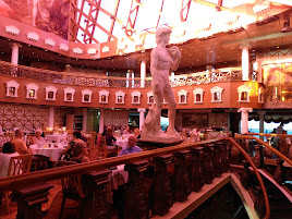 We got there a bit early, but we didn’t have to wait long. If you’ve never seen David’s Steakhouse, you need to know how elegant it is. It’s got a huge state of David by Michaelangelo at the entrance, and beautiful paintings all around. The most unique feature of the steakhouse is that the ship’s funnel is the ceiling of the room, and it’s all stained glass. It casts a warm glow over the room.