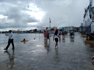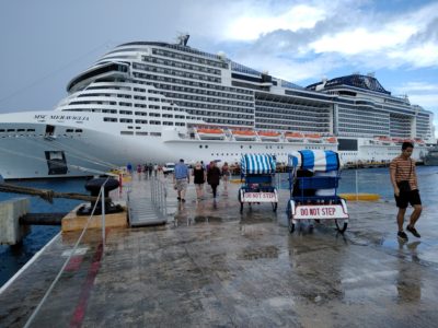 Once the rain let up we decided that we’d better head back to the ship.  We showed our passport and ship card to the agent, and headed back down the long dock towards the ship.  It was actually much cooler after the rain, and felt very pleasant.  This is also a good place to take pictures of the ship.  MSC provided wet towels for the face and fruit water outside the ship for returning guests, which is nice.