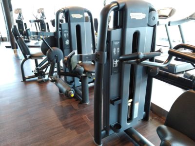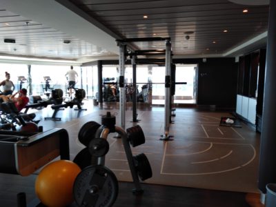 They have several elliptical machines and treadmills.  The treadmills have a screen to make you feel like you’re walking on a beach or another local.  The gym doesn’t look out on the water, but on the pool deck.  There were also free weights and about 7 weight machines.