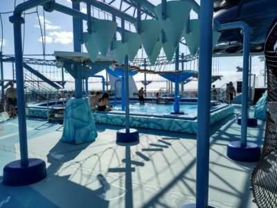 The slides are by the kiddie pool area on top of the ship. The kid’s area is a really fun area, with a shallow pool and lots of water features that spray and pour water on your head. It’s very colorful, and has a lot of cute sculptures of different animals. It was almost empty every time I was up there. There are deck chairs up there, and it’s a good place to find some quiet.