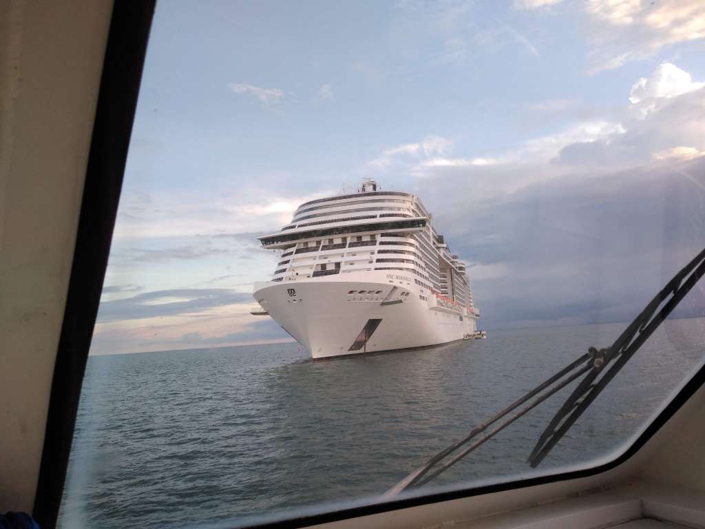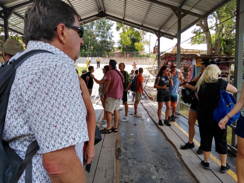 When you cruise to Belize the ship anchors five miles off shore, and you take a ferry (tender) boat into port. It’s a large tender boat with seats on the main deck and on the roof. They did pack them pretty full, and there were some people standing. The ride took about fifteen minutes.