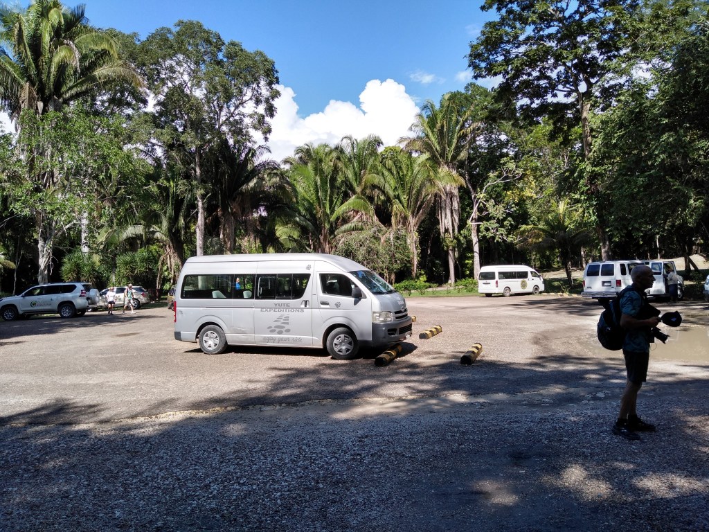 Once we got to the pyramid we got out of the bus, then had to get on a hand cranked ferry to cross the small river. On the other side we got into vans and went the last mile up the mountain. In this area you will find clean restrooms and a small store with snacks and bottled water. You will see armed guards walking around the area. Bring sunscreen and bug spray.