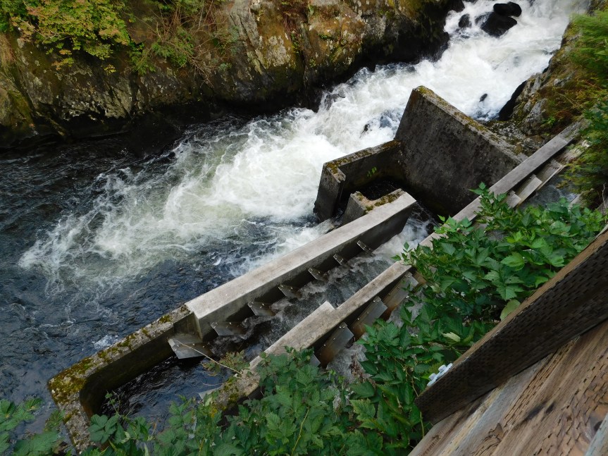We started out by walking to Creek Street to see the Salmon on the fish ladder. There were quite a few salmon trying to swim upstream and the town had created a ladder to make it a little bit easier for them. Still, we saw a lot of dead salmon strown around, some in very high places. The area must have flooded recently. It’s quite a struggle for the salmon to climb up a waterfall and upstream. They’d make a bit of headway, and then fall back again. It’s tough to be a salmon. On the way back out to town, we saw seals and sea lions in the marina feasting on the salmon.