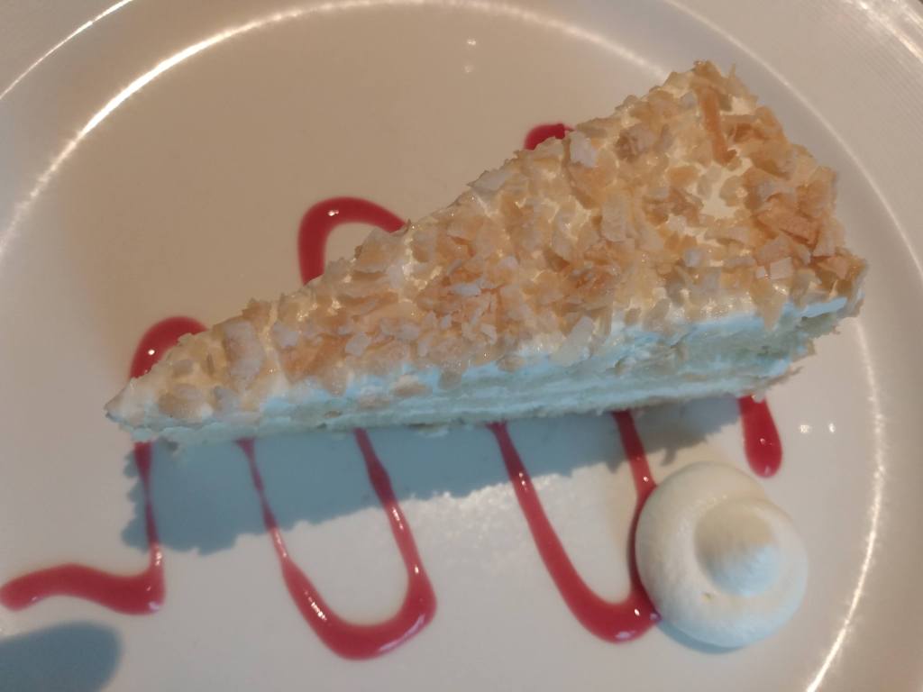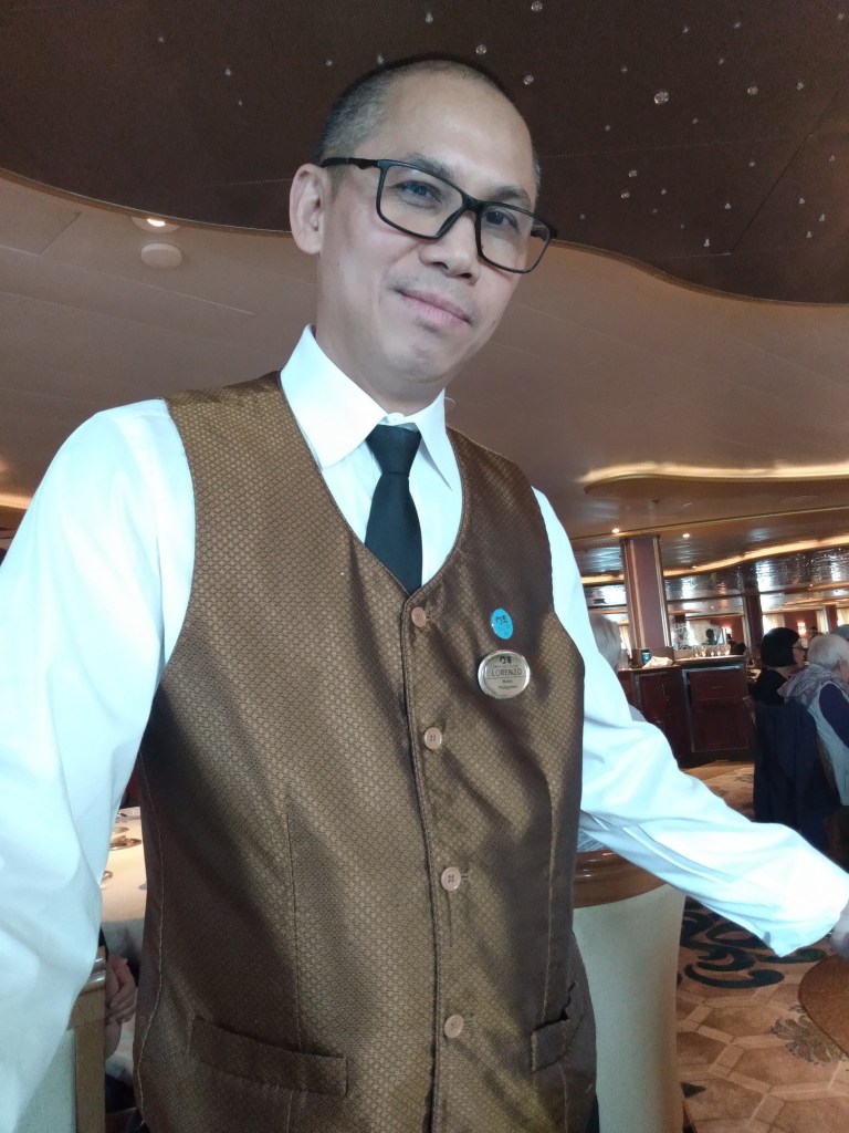The second dress up night had Land & Sea on the menu, which is steak and lobster tail. This lobster was much better than some of the other ships have. I really enjoyed it. Our wait team, Lorenzo and Awmi, have been really good. We’re the only regulars at our table, and they don’t forget our preferences. Princess Cruises don’t have the dancing waiters or singing during dinner, so don’t expect that. No towel animals either. We have sat with a number of very interesting people during the cruise, some of them more than once.